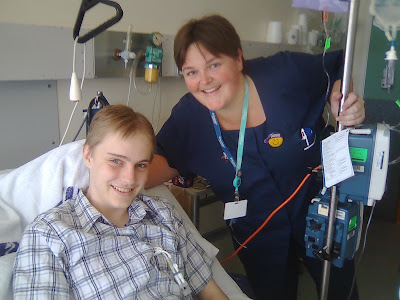 Another shaky start to the day, but a bit of laughter always gets you through the tough bits. Logan appears to find my singing hilarious - I thought it would be comforting! Oh well... We both got to sleep in this morning, and Logan took a wee while to summon up the courage to eat breaky but it all went well. Our day nurse, Donna, is fabulous. She got him joking and laughing, as did Dr Jameson. I don't know how his family survives, he never seems to say a sane thing!